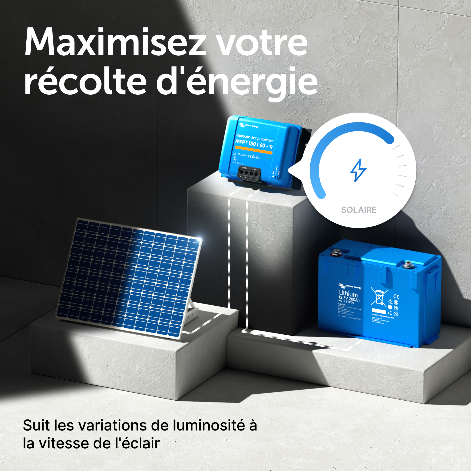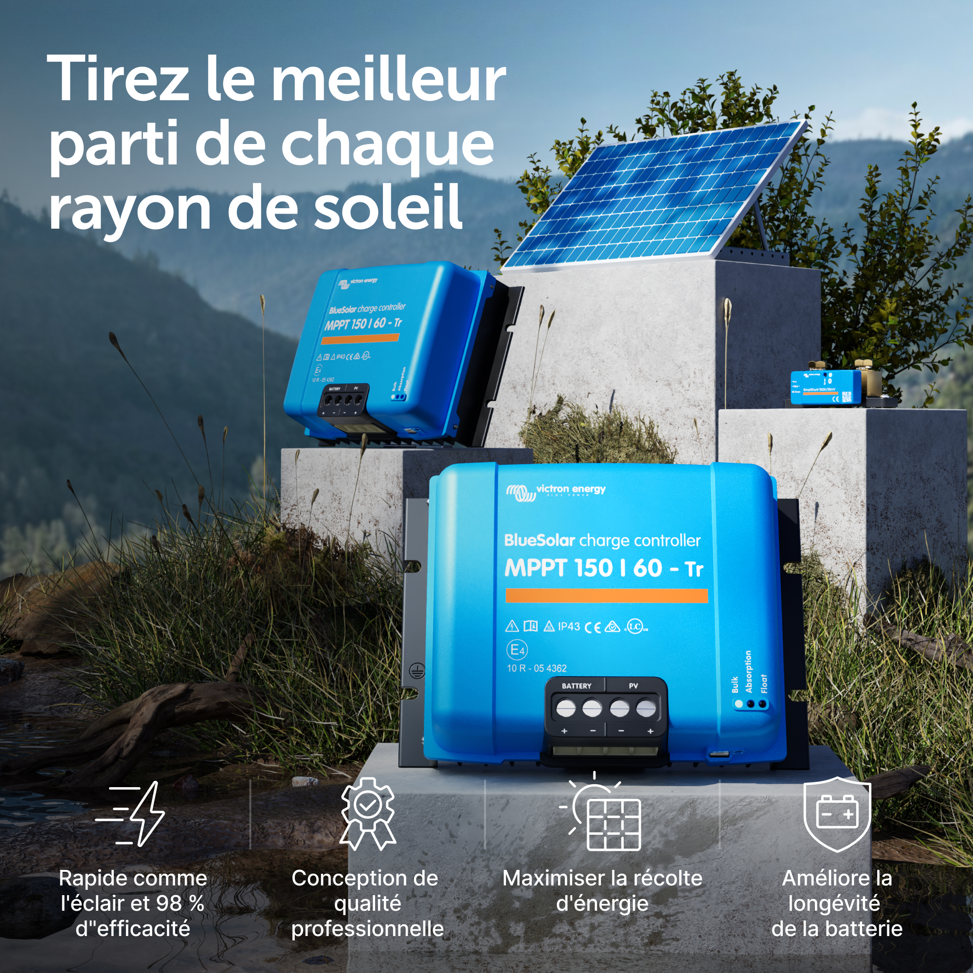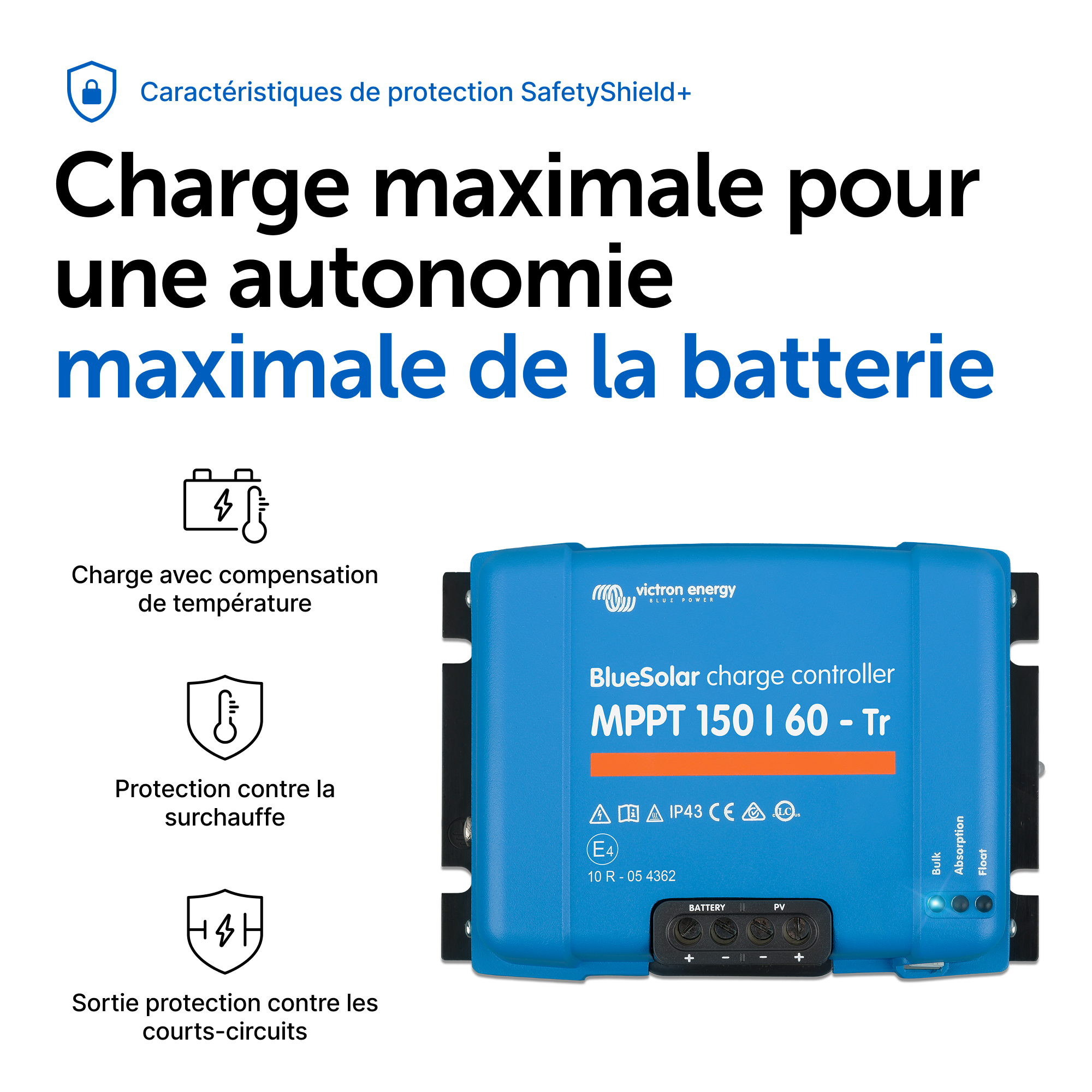 Un chargeur solaire récupère l'énergie provenant de vos panneaux solaires, et il la stocke dans vos batteries. Utilisant la technologie la plus récente et la plus rapide, le BlueSolar maximise cette « récolte » d'énergie, en la gérant intelligemment de manière à obtenir une pleine charge le plus rapidement possible. Le BlueSolar maintient votre batterie en état et prolonge sa durée de vie.