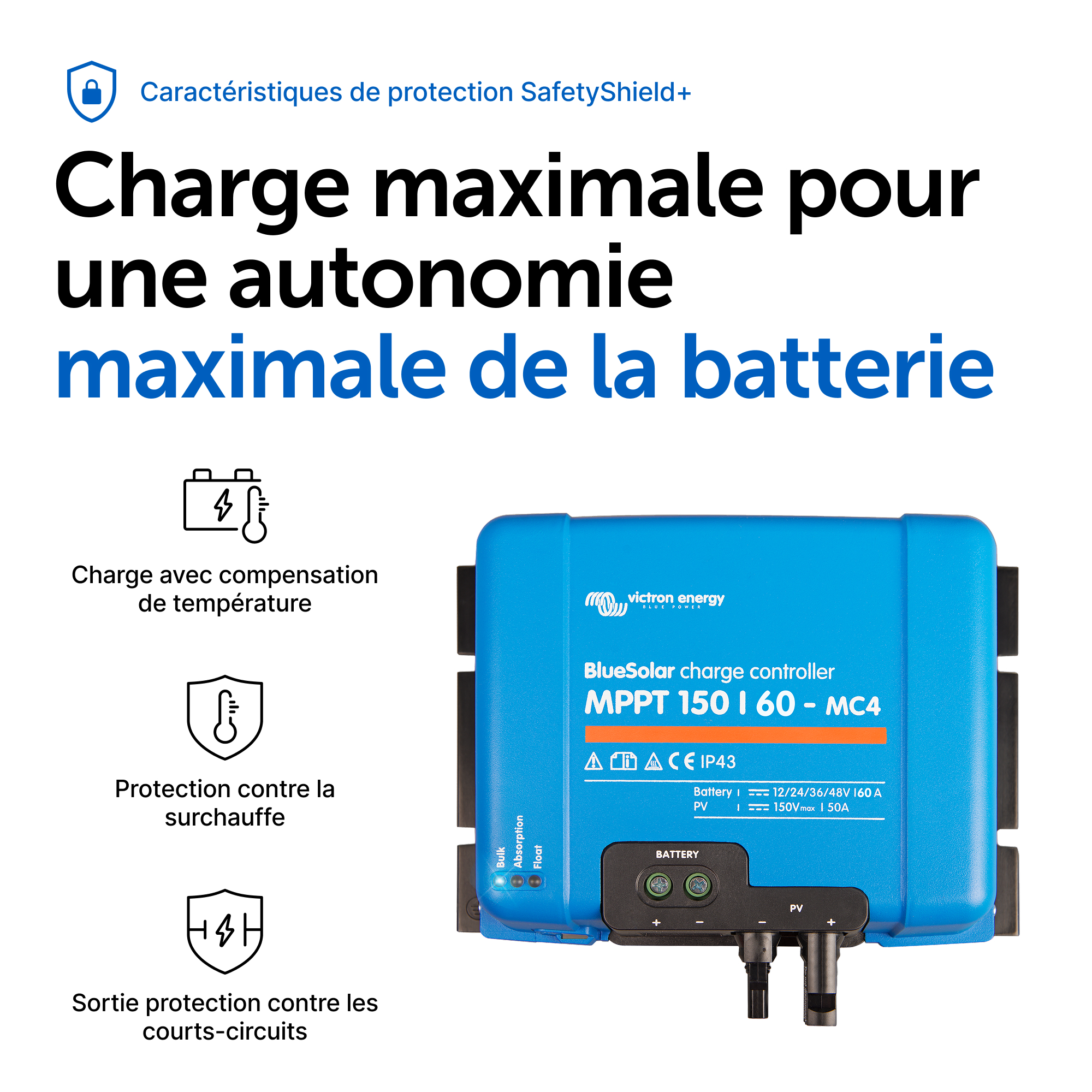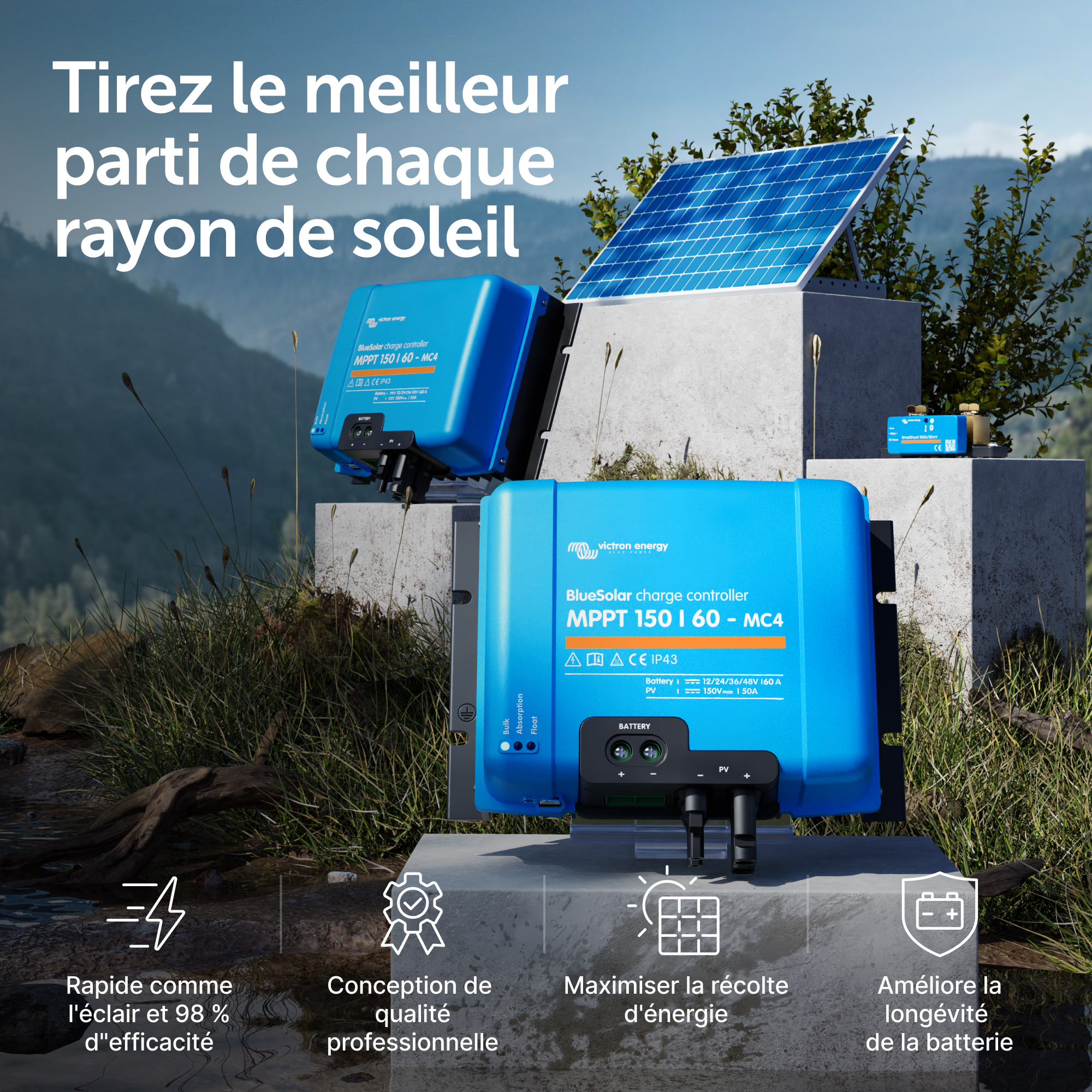 Un chargeur solaire récupère l'énergie provenant de vos panneaux solaires, et il la stocke dans vos batteries. Utilisant la technologie la plus récente et la plus rapide, le BlueSolar maximise cette « récolte » d'énergie, en la gérant intelligemment de manière à obtenir une pleine charge le plus rapidement possible. Le BlueSolar maintient votre batterie en état et prolonge sa durée de vie.