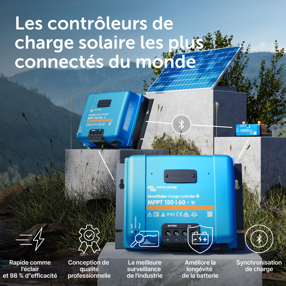 Un chargeur solaire récupère l'énergie provenant de vos panneaux solaires, et il la stocke dans vos batteries. Utilisant la technologie la plus récente et la plus rapide, le SmartSolar maximise cette « récolte » d'énergie, en la gérant intelligemment de manière à obtenir une pleine charge le plus rapidement possible. Le SmartSolar maintient votre batterie en état et prolonge sa durée de vie.