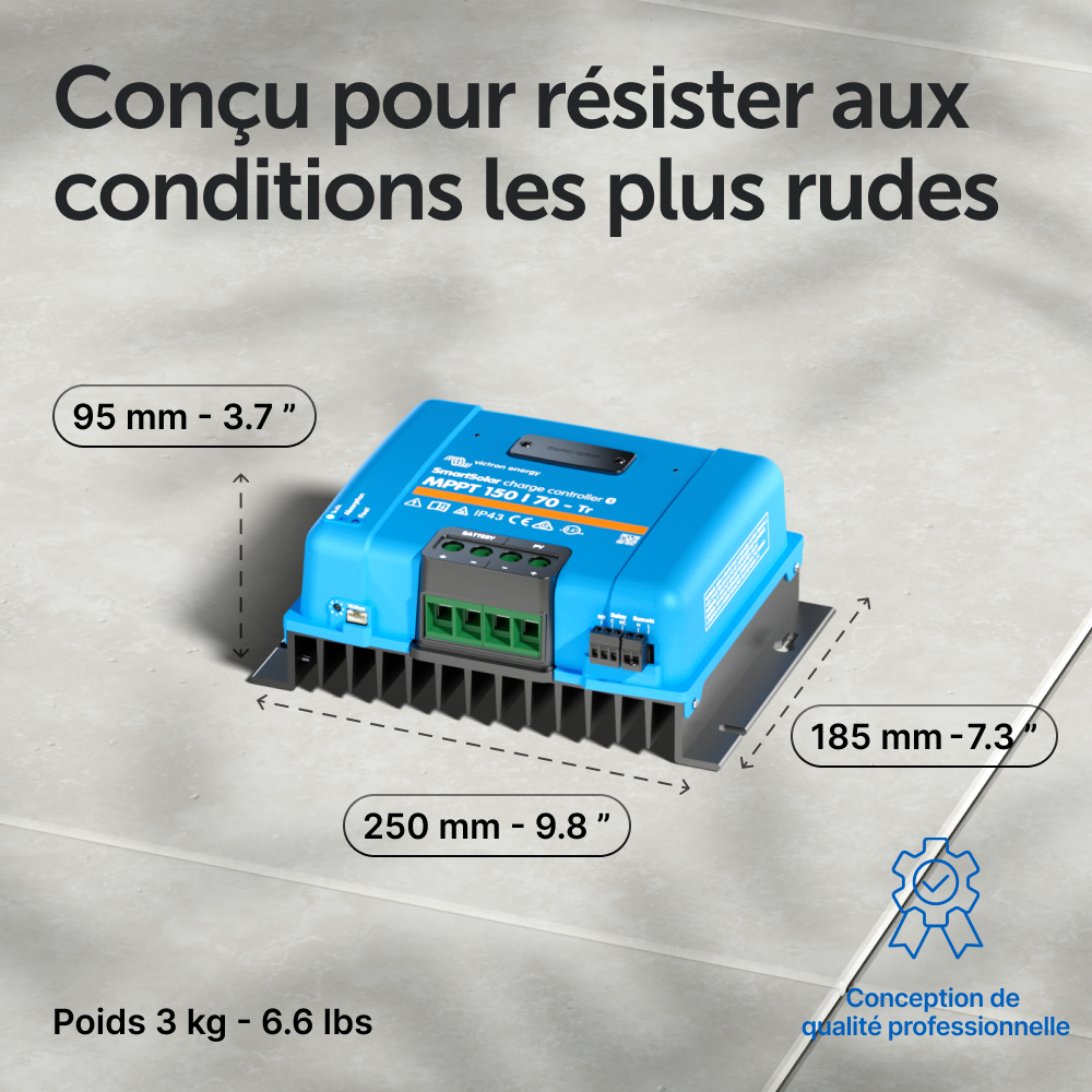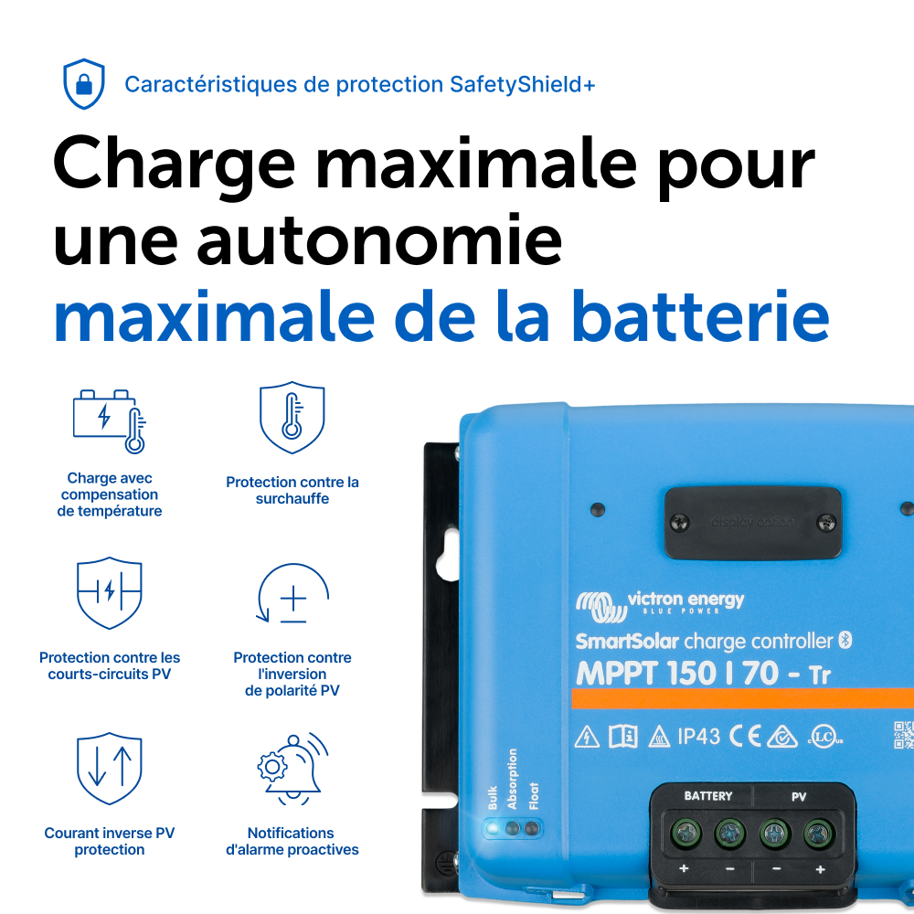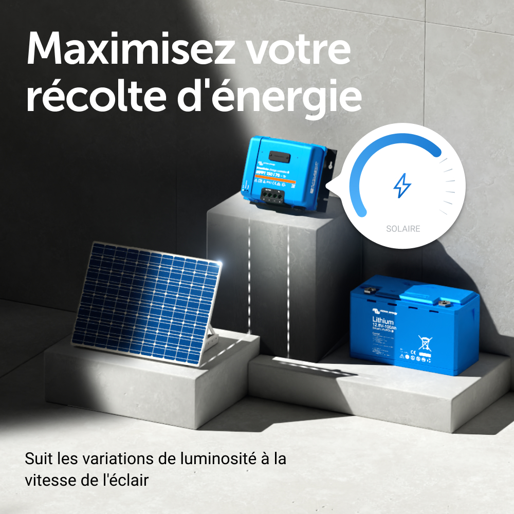 Un chargeur solaire récupère l'énergie provenant de vos panneaux solaires, et il la stocke dans vos batteries. Utilisant la technologie la plus récente et la plus rapide, le SmartSolar maximise cette « récolte » d'énergie, en la gérant intelligemment de manière à obtenir une pleine charge le plus rapidement possible. Le SmartSolar maintient votre batterie en état et prolonge sa durée de vie.