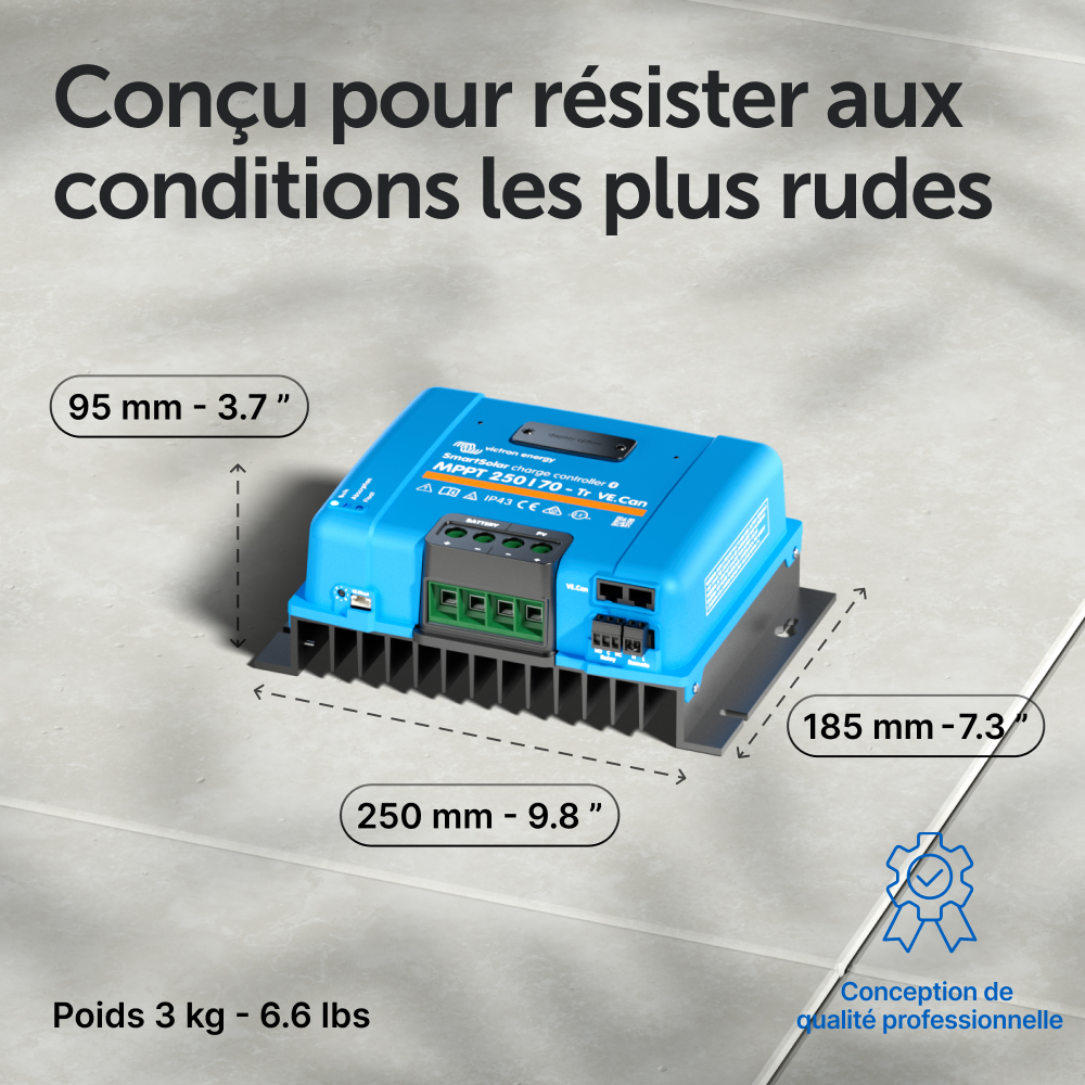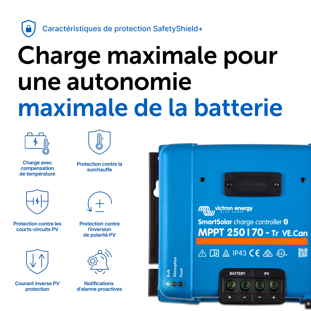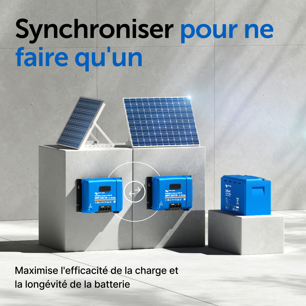 Le chargeur MPPT SmartSolar avec VE.Can utilise la technologie la plus récente et rapide pour convertir l'énergie provenant d'un champ solaire en énergie qui charge de manière optimale un banc de batteries.