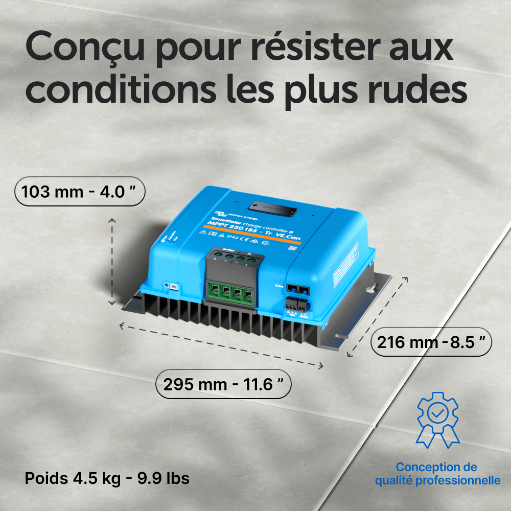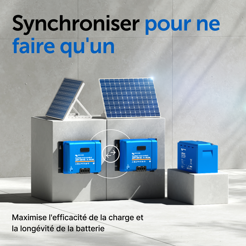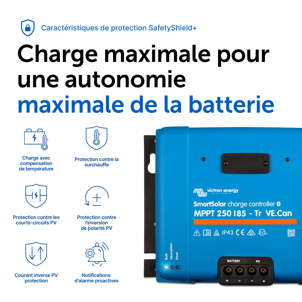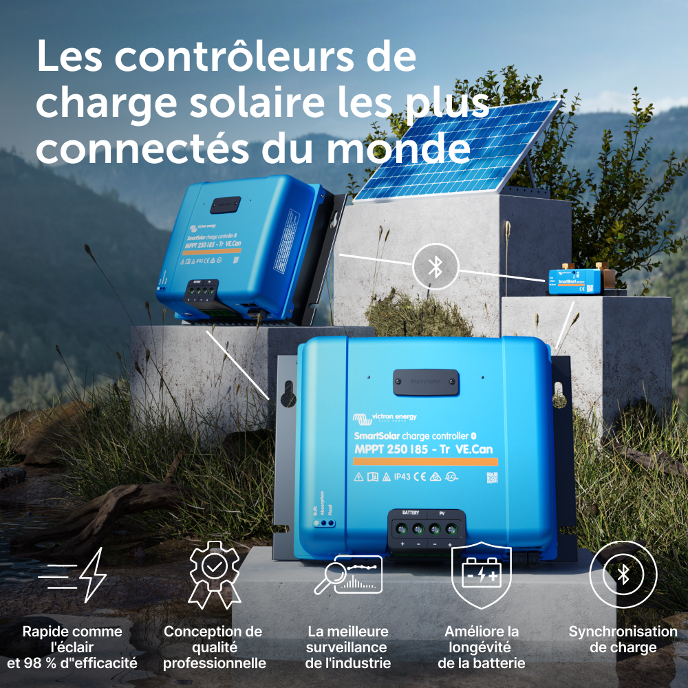 Le chargeur MPPT SmartSolar avec VE.Can utilise la technologie la plus récente et rapide pour convertir l'énergie provenant d'un champ solaire en énergie qui charge de manière optimale un banc de batteries.