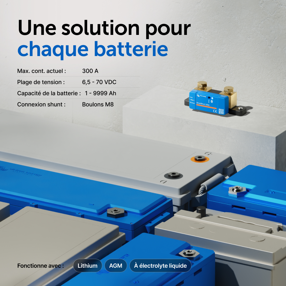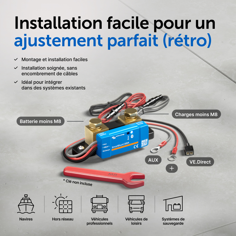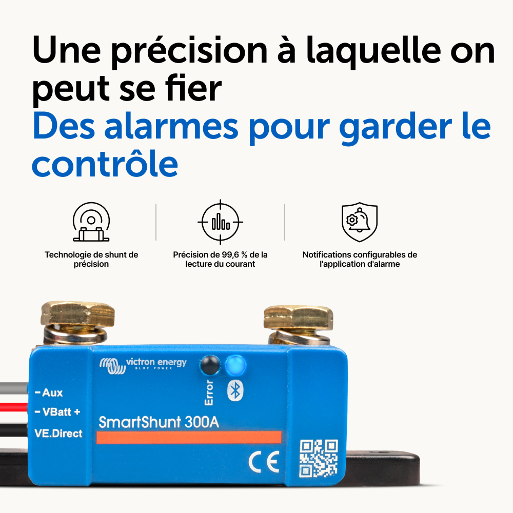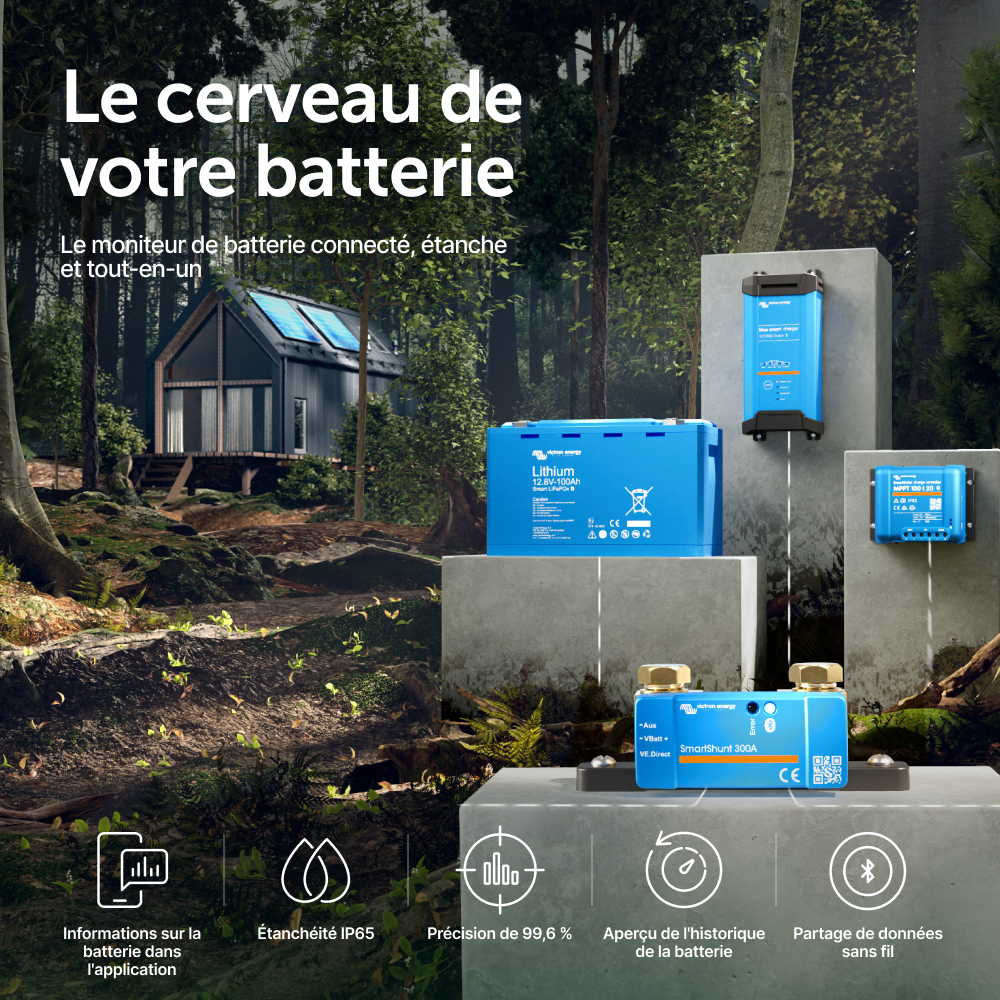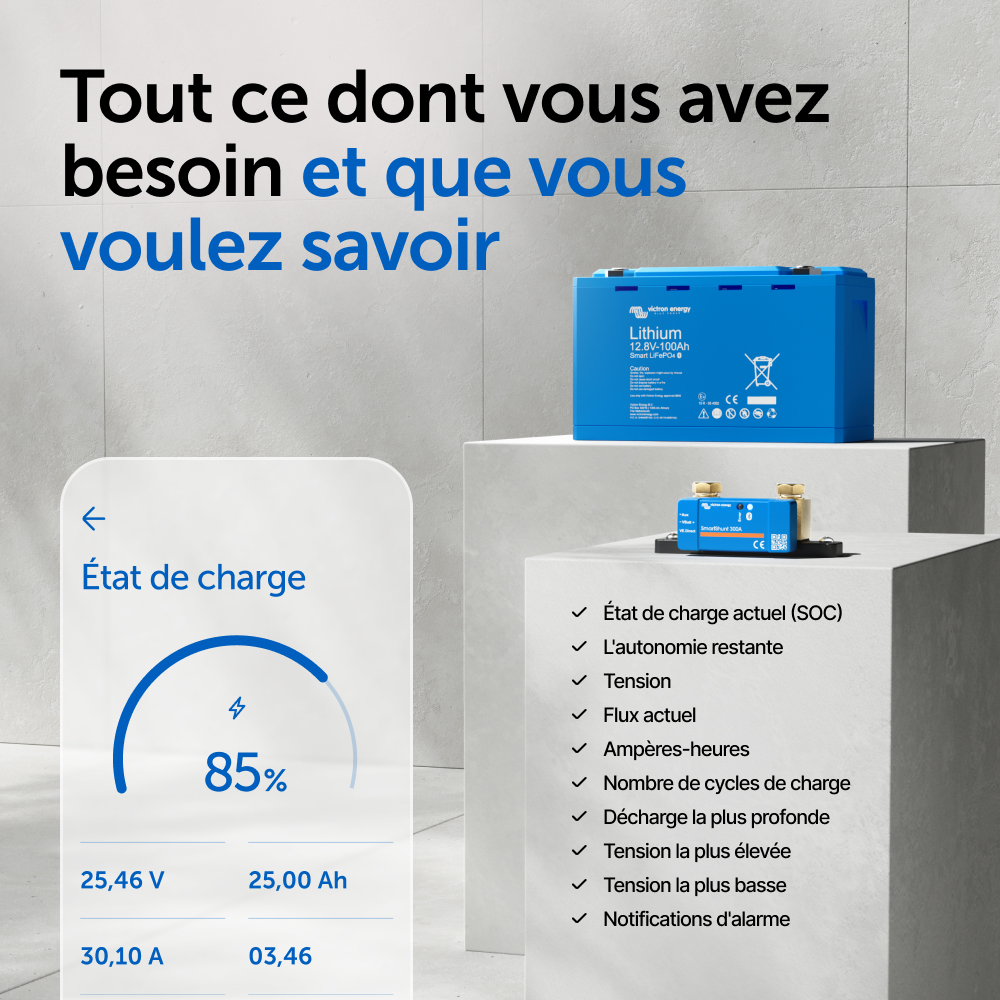 Le SmartShunt est un contrôleur de batterie tout-en-un, mais sans écran. Votre téléphone sert d'écran. Le SmartShunt se connecte par Bluetooth à l'application VictronConnect sur votre téléphone (ou tablette), et vous pouvez lire aisément tous les paramètres de batterie qui sont sous surveillance comme par exemple l'état de charge, l'autonomie restante, l'information historique et bien plus encore.