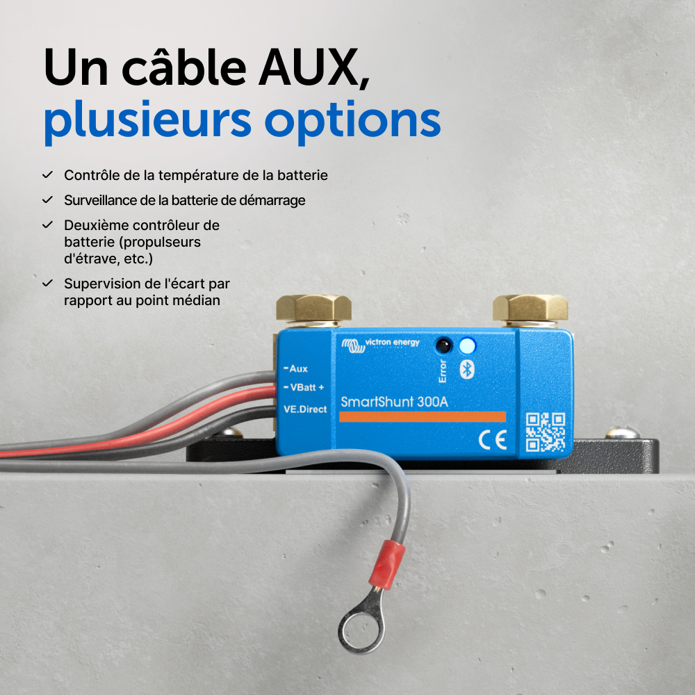 Le SmartShunt est équipé de Bluetooth, d'un port VE.Direct et d'une connexion qui peut être utilisée pour surveiller une deuxième batterie, un point médian ou une sonde de température.