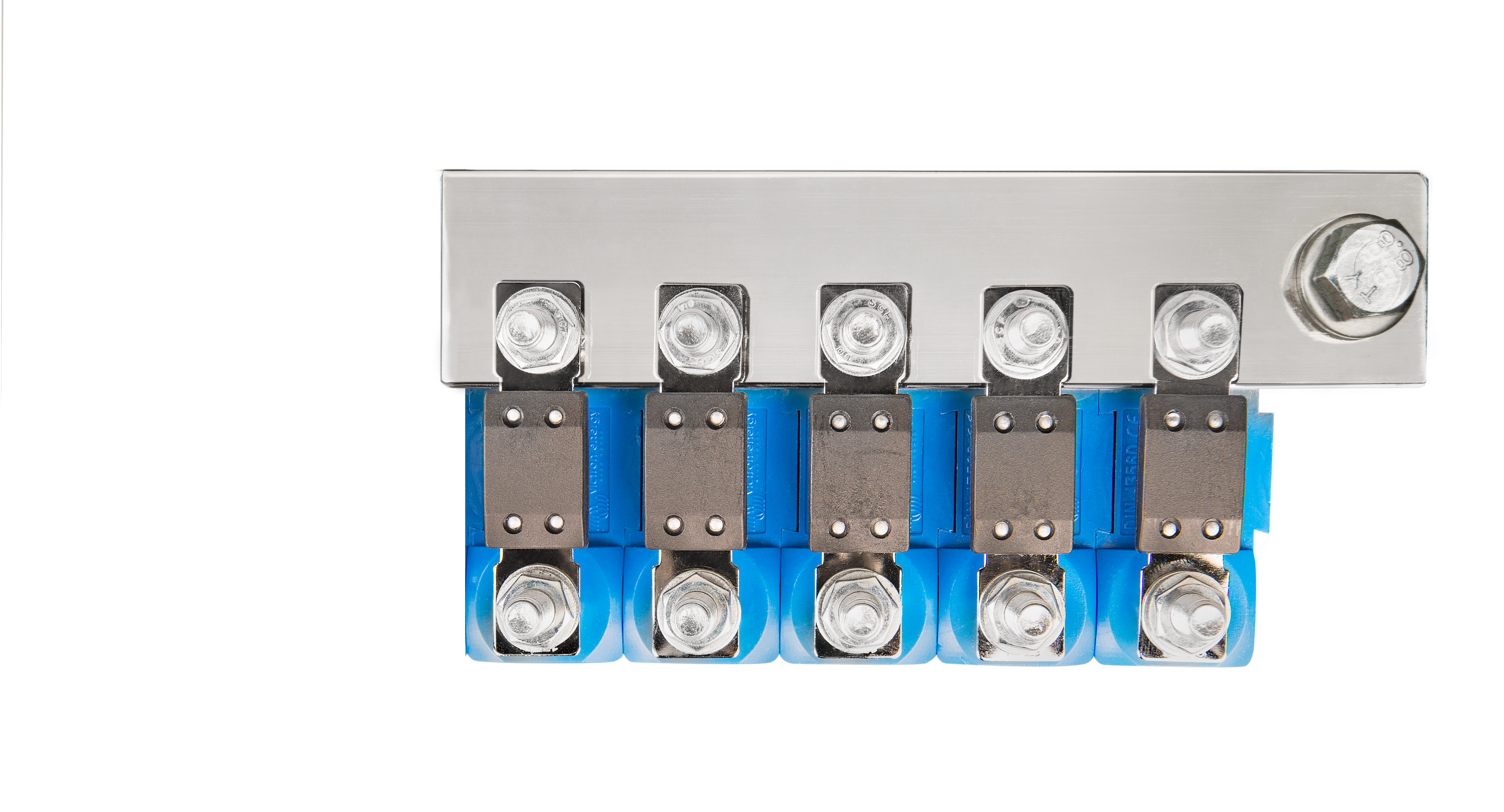 - Un boîtier à fusibles modulaire, pour les fusibles MEGA uniquement. Avec une barre de bus (en option) pour raccorder efficacement plusieurs fusibles.