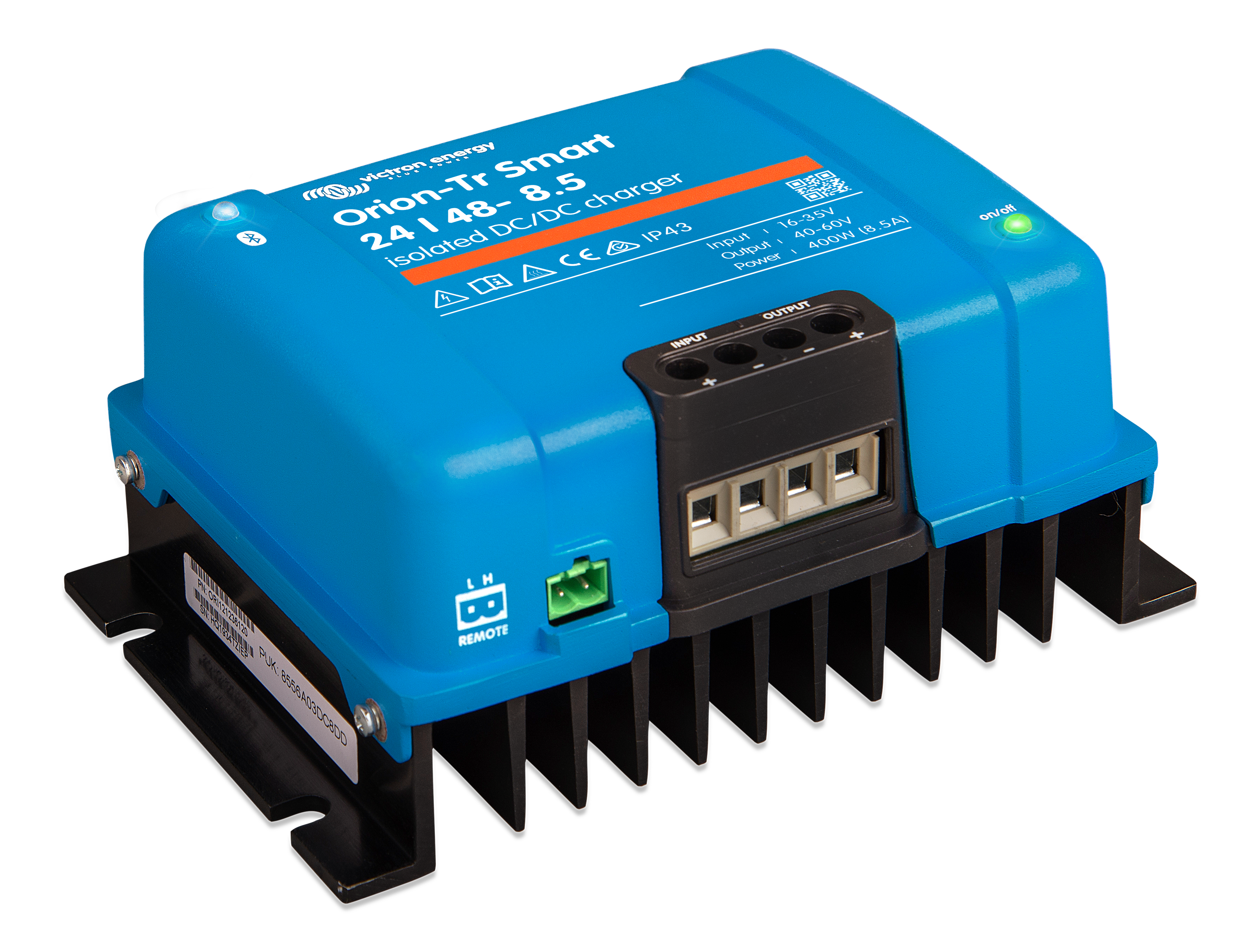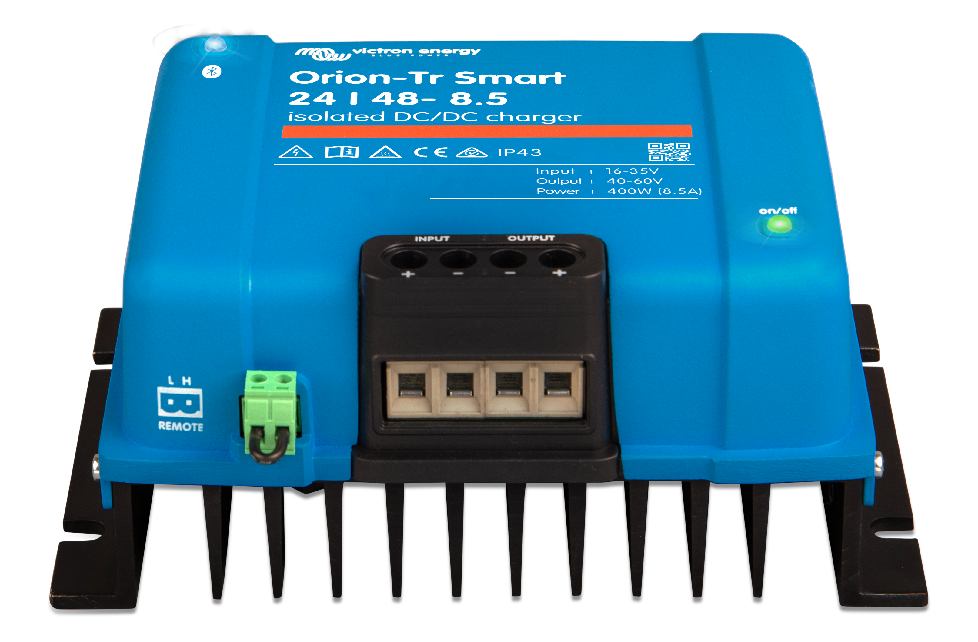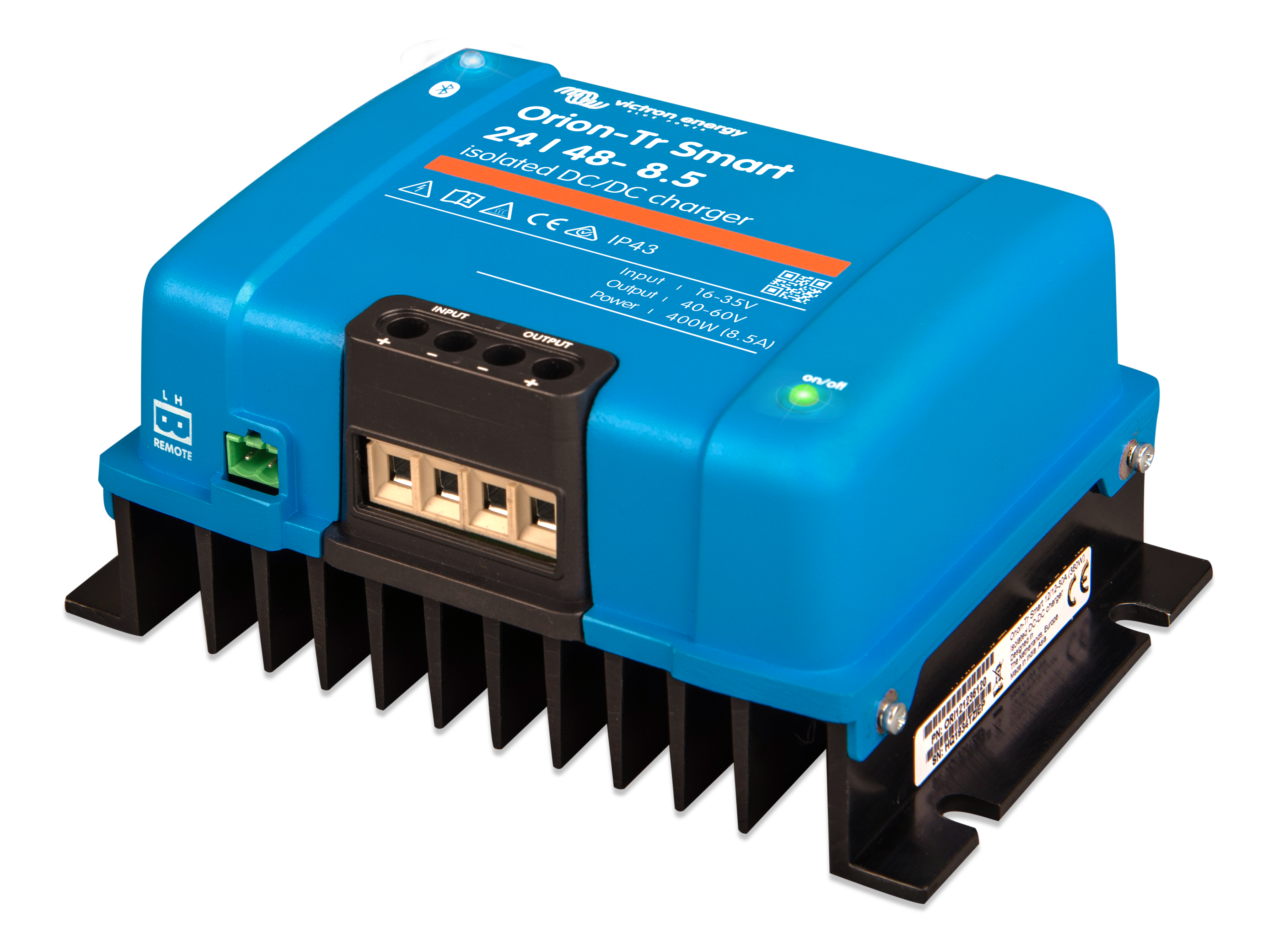 Le chargeur Orion-Tr Smart peut être utilisé dans des systèmes de 12, 24 ou 48 V, et il s'adapte à la fois aux batteries au plomb et au lithium. Les modèles sont disponibles jusqu'à une puissance de 400 W, et un nombre illimité de plusieurs unités peut être raccordé en parallèle pour augmenter la puissance de sortie.