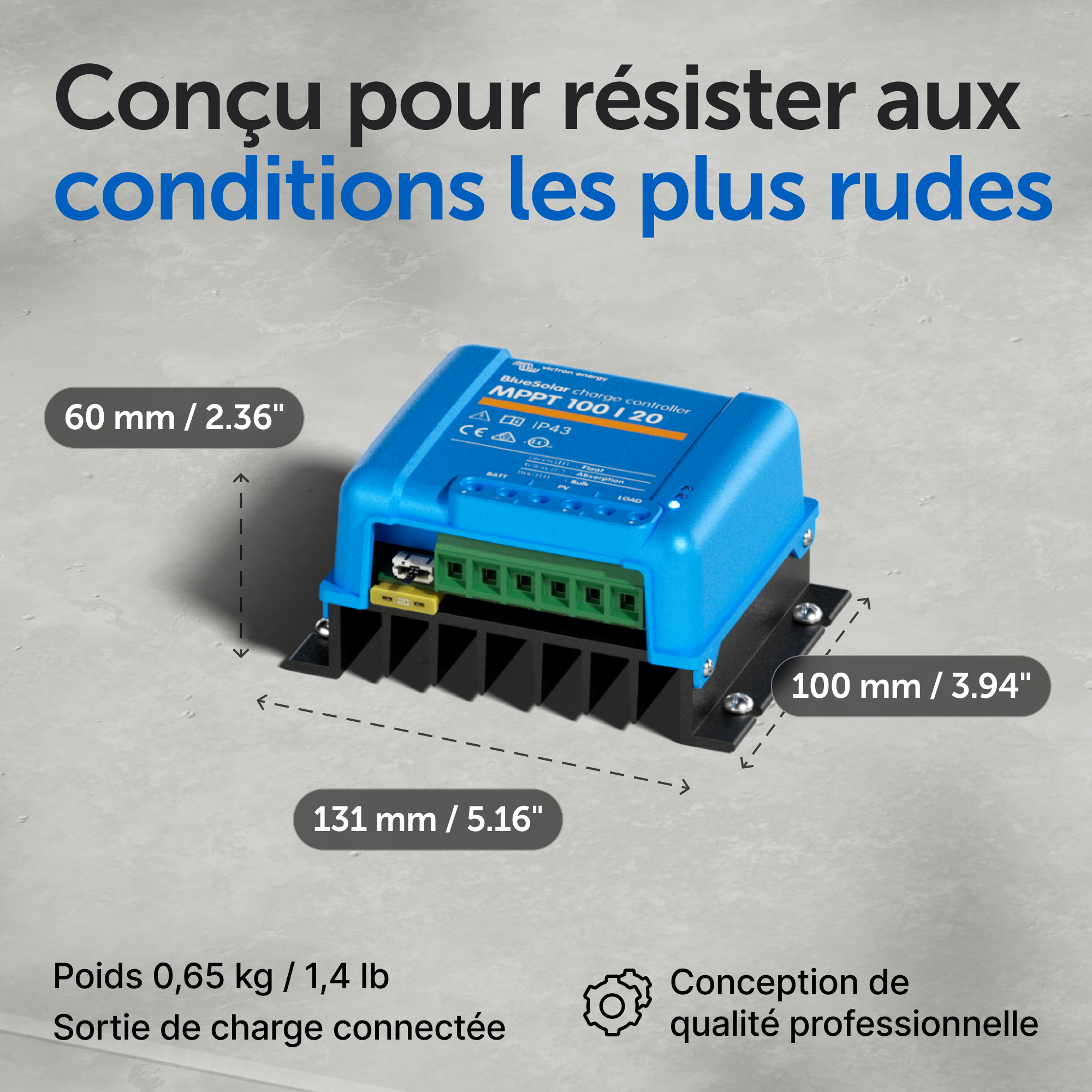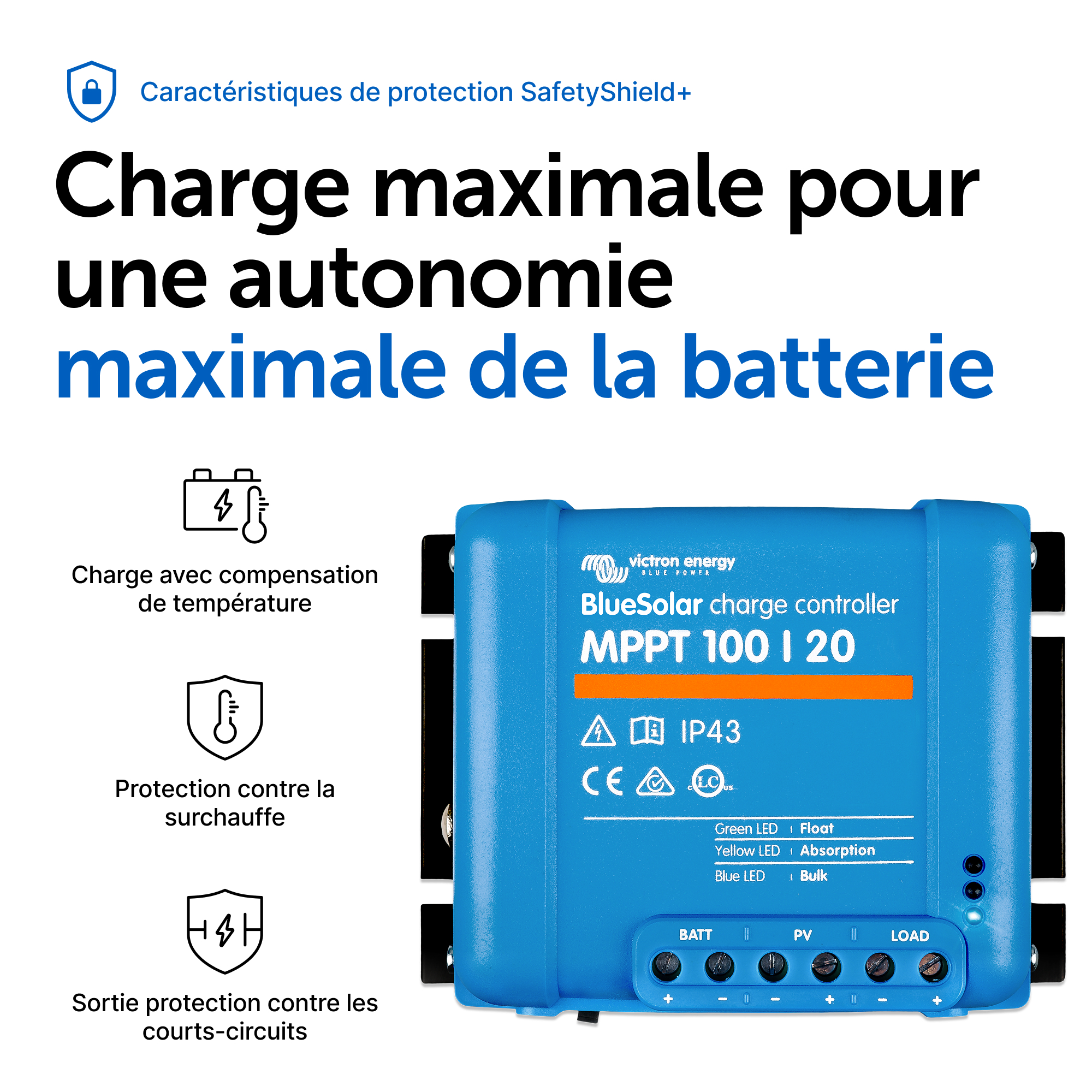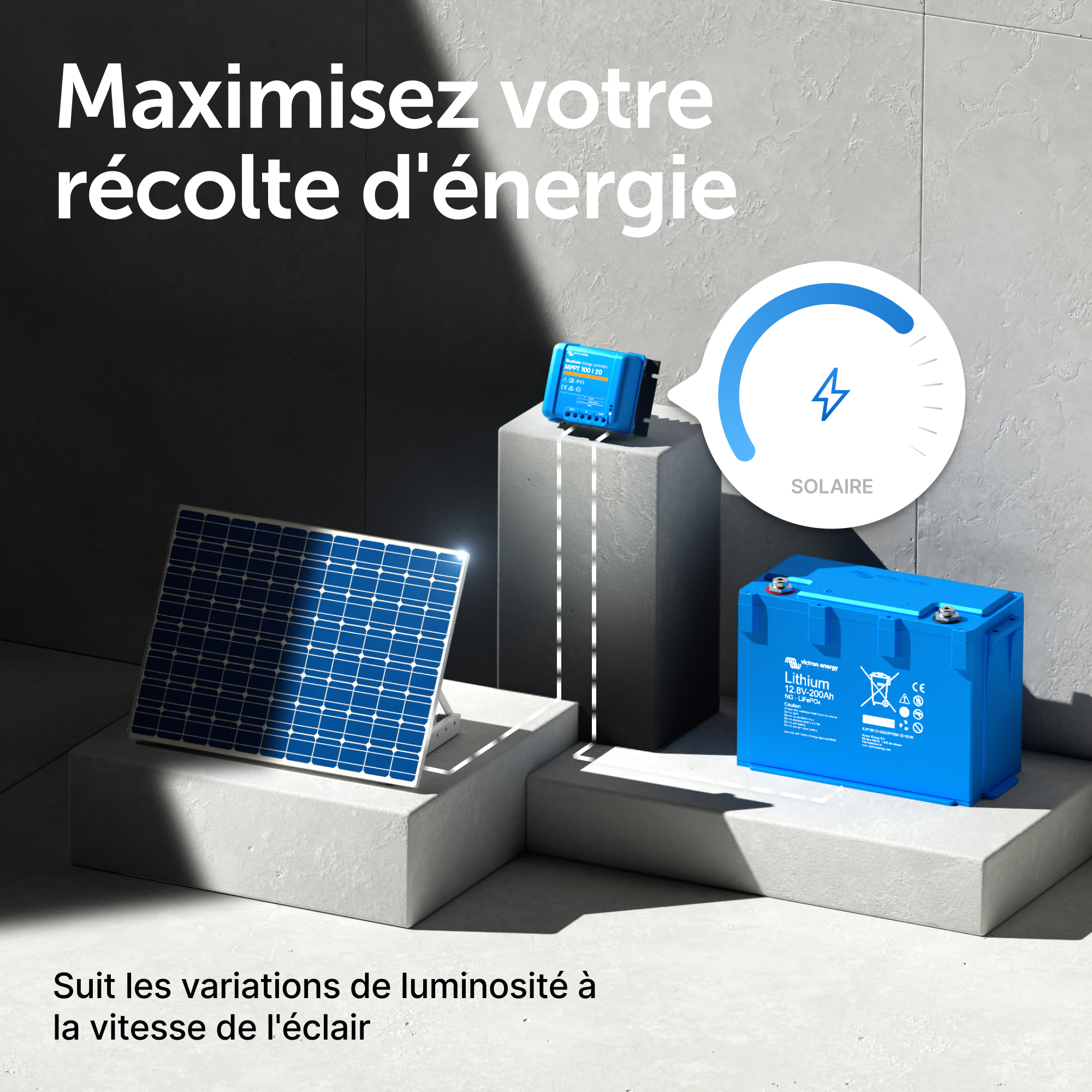 Un chargeur solaire récupère l'énergie provenant de vos panneaux solaires, et il la stocke dans vos batteries. Utilisant la technologie la plus récente et la plus rapide, le BlueSolar maximise cette « récolte » d'énergie, en la gérant intelligemment de manière à obtenir une pleine charge le plus rapidement possible. Le BlueSolar maintient votre batterie en état et prolonge sa durée de vie.