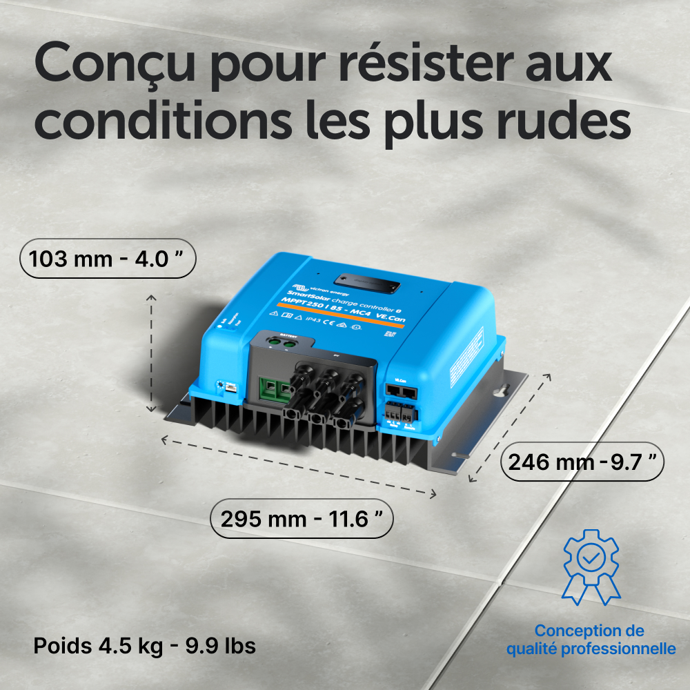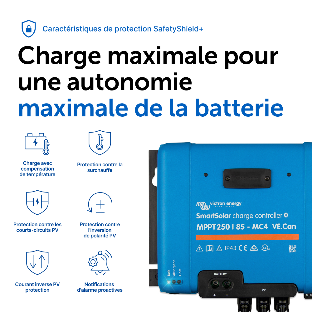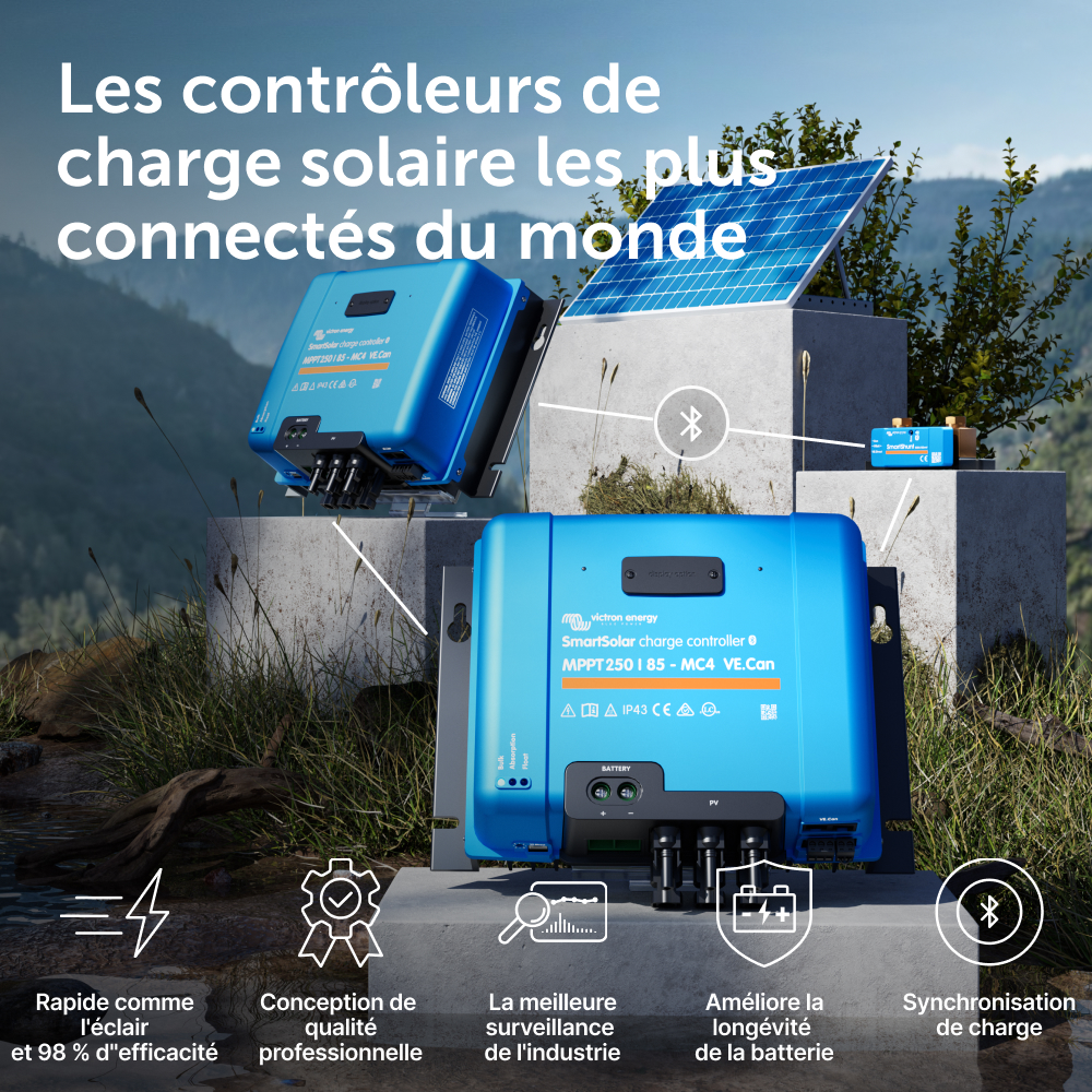 Le chargeur MPPT SmartSolar avec VE.Can utilise la technologie la plus récente et rapide pour convertir l'énergie provenant d'un champ solaire en énergie qui charge de manière optimale un banc de batteries.