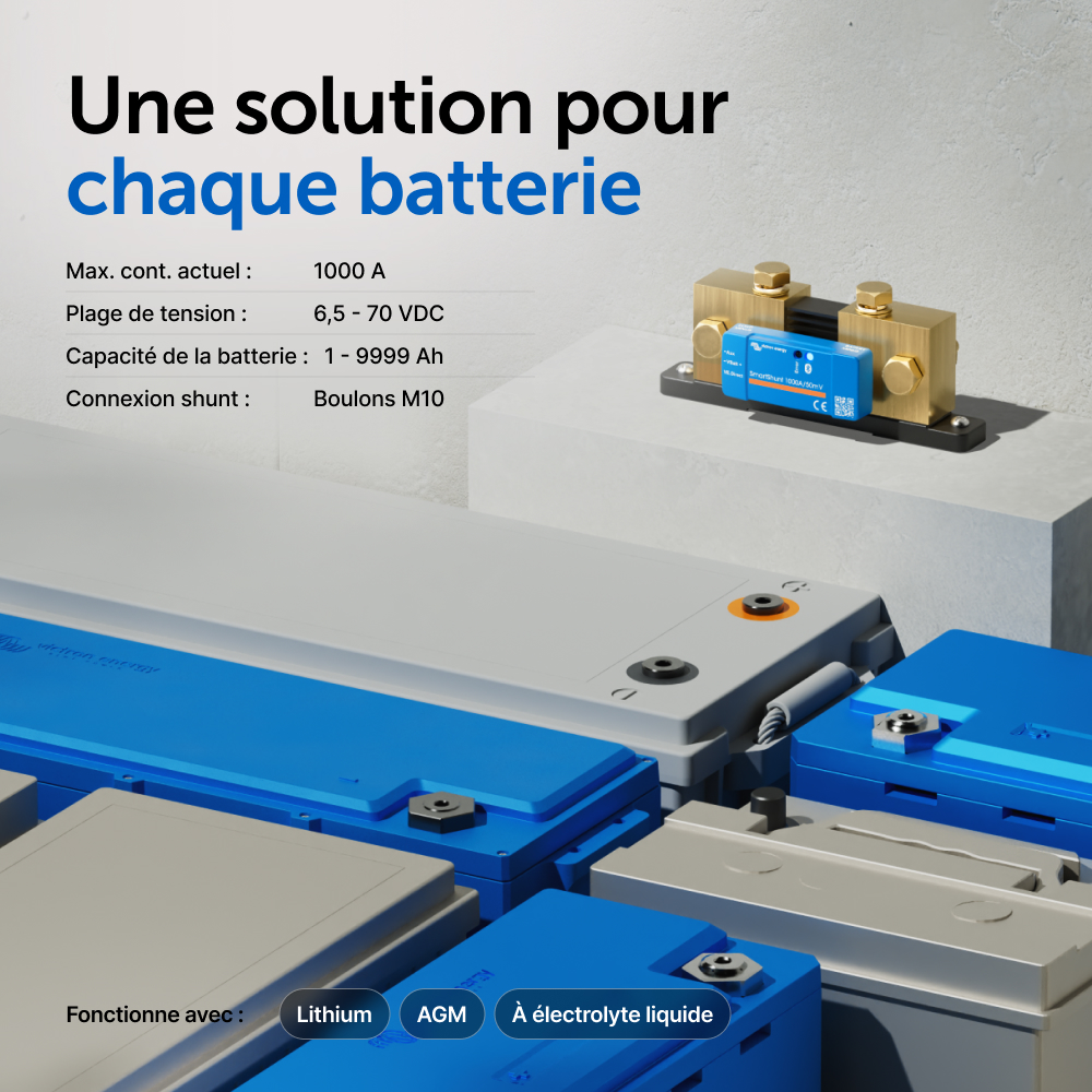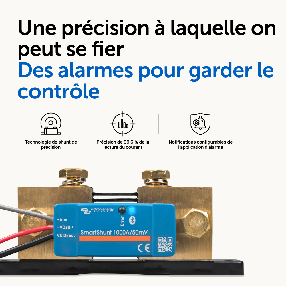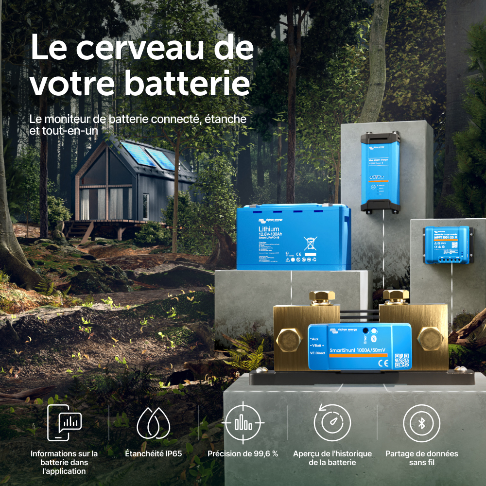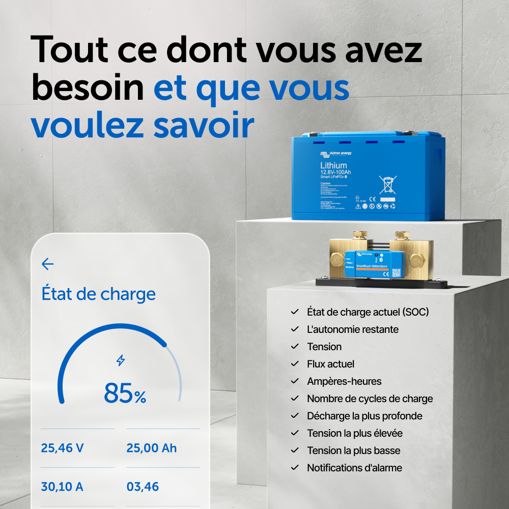 Le SmartShunt est un contrôleur de batterie tout-en-un, mais sans écran. Votre téléphone sert d'écran. Le SmartShunt se connecte par Bluetooth à l'application VictronConnect sur votre téléphone (ou tablette), et vous pouvez lire aisément tous les paramètres de batterie qui sont sous surveillance comme par exemple l'état de charge, l'autonomie restante, l'information historique et bien plus encore.