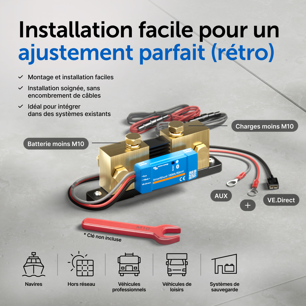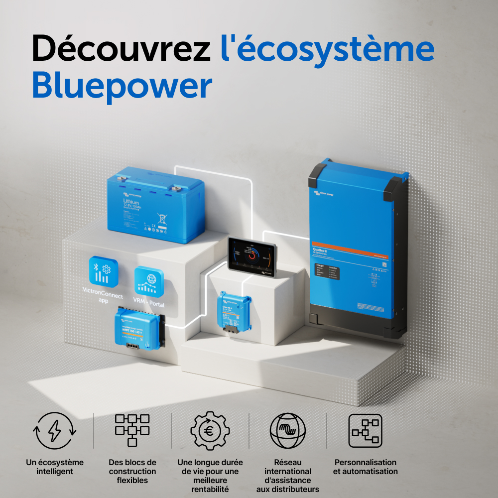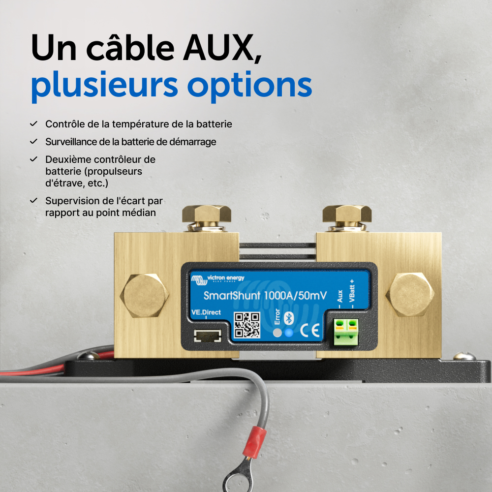 Le SmartShunt représente une bonne alternative au contrôleur de batterie BMV, en particulier pour des systèmes dans lesquels on souhaite superviser une batterie, mais avec moins de câble et de désordre.