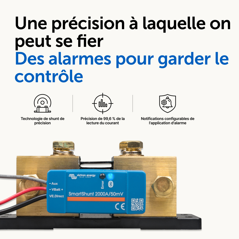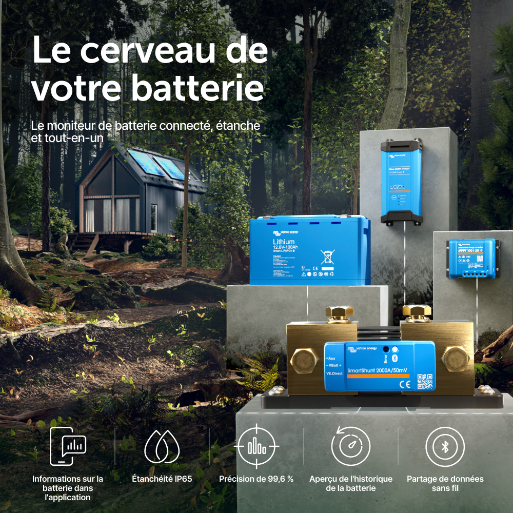 Le SmartShunt est un contrôleur de batterie tout-en-un, mais sans écran. Votre téléphone sert d'écran. Le SmartShunt se connecte par Bluetooth à l'application VictronConnect sur votre téléphone (ou tablette), et vous pouvez lire aisément tous les paramètres de batterie qui sont sous surveillance comme par exemple l'état de charge, l'autonomie restante, l'information historique et bien plus encore.