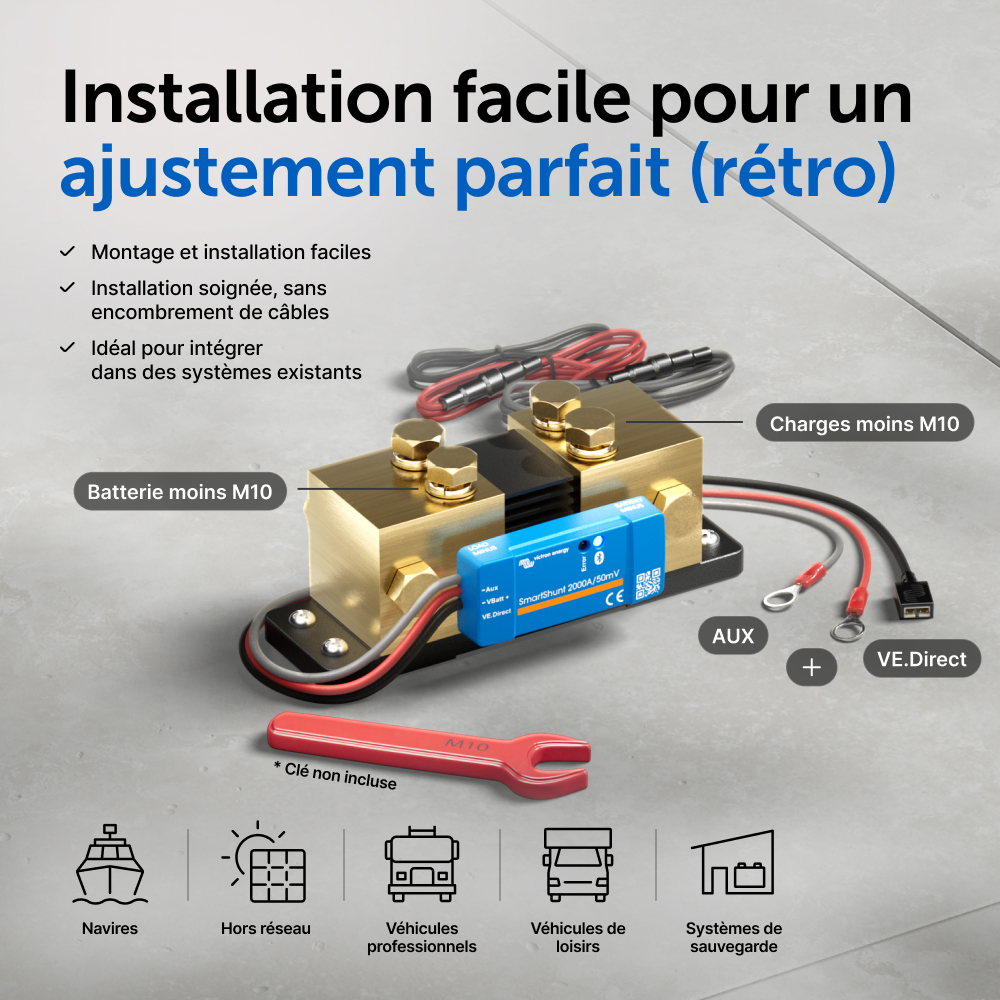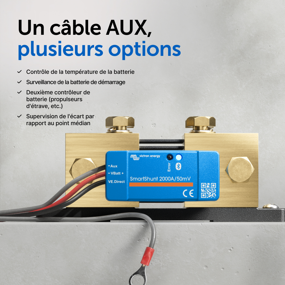 Le SmartShunt représente une bonne alternative au contrôleur de batterie BMV, en particulier pour des systèmes dans lesquels on souhaite superviser une batterie, mais avec moins de câble et de désordre.