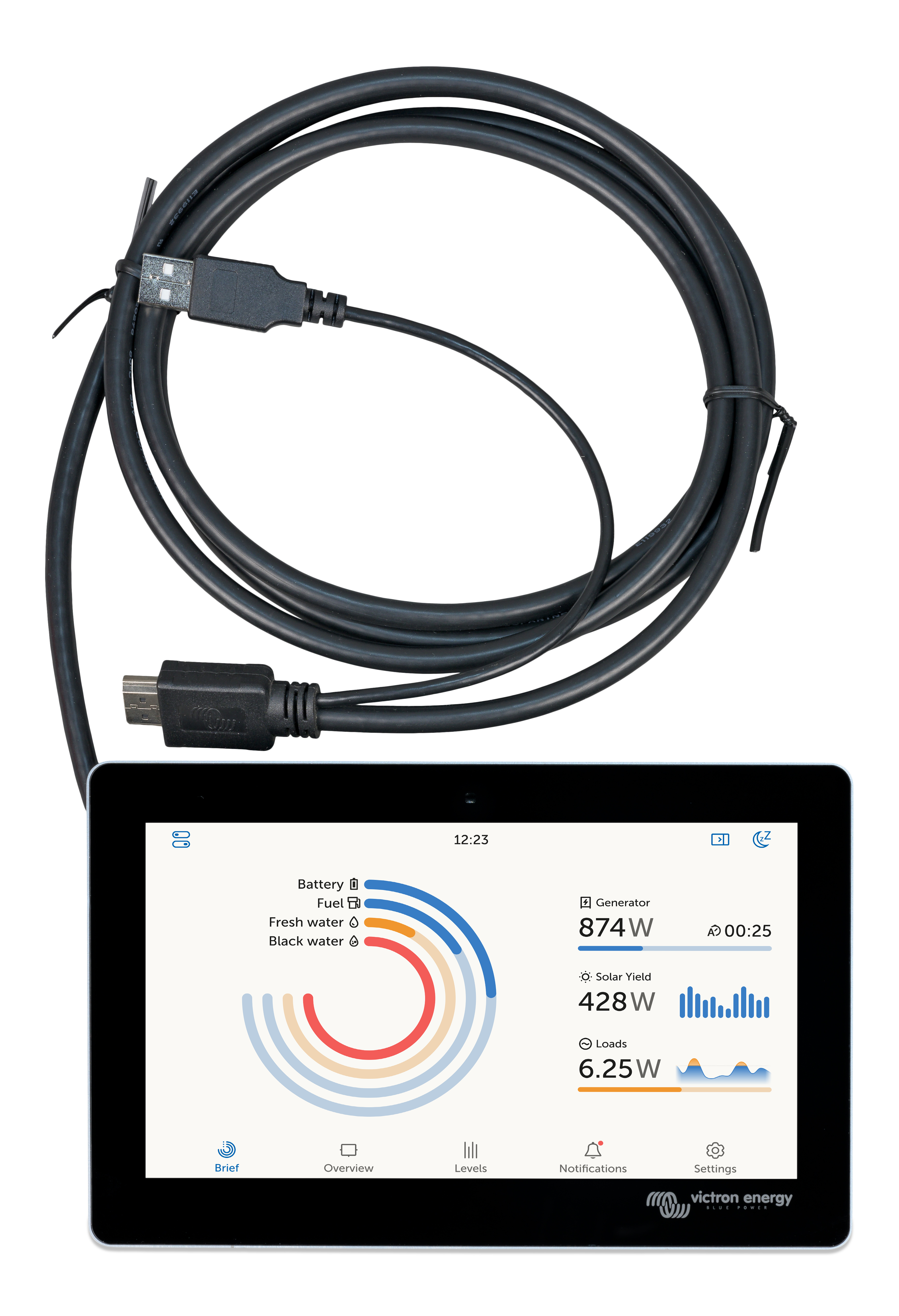 Les accessoires GX Touch 50 et GX Touch 70 sont des écrans pour votre Cerbo GX. Ces écrans tactiles de 5 et 7 pouces vous permettent d'avoir une vue d'ensemble instantanée de votre système et de régler les paramètres en un clin d'œil. Branchés au Cerbo GX simplement avec un câble, leur conception extra-fine et étanche, permettant de l’installer sur l’appareil, et sa facilité d'installation leur donnent une grande souplesse si vous souhaitez créer un tableau de bord propre et net.