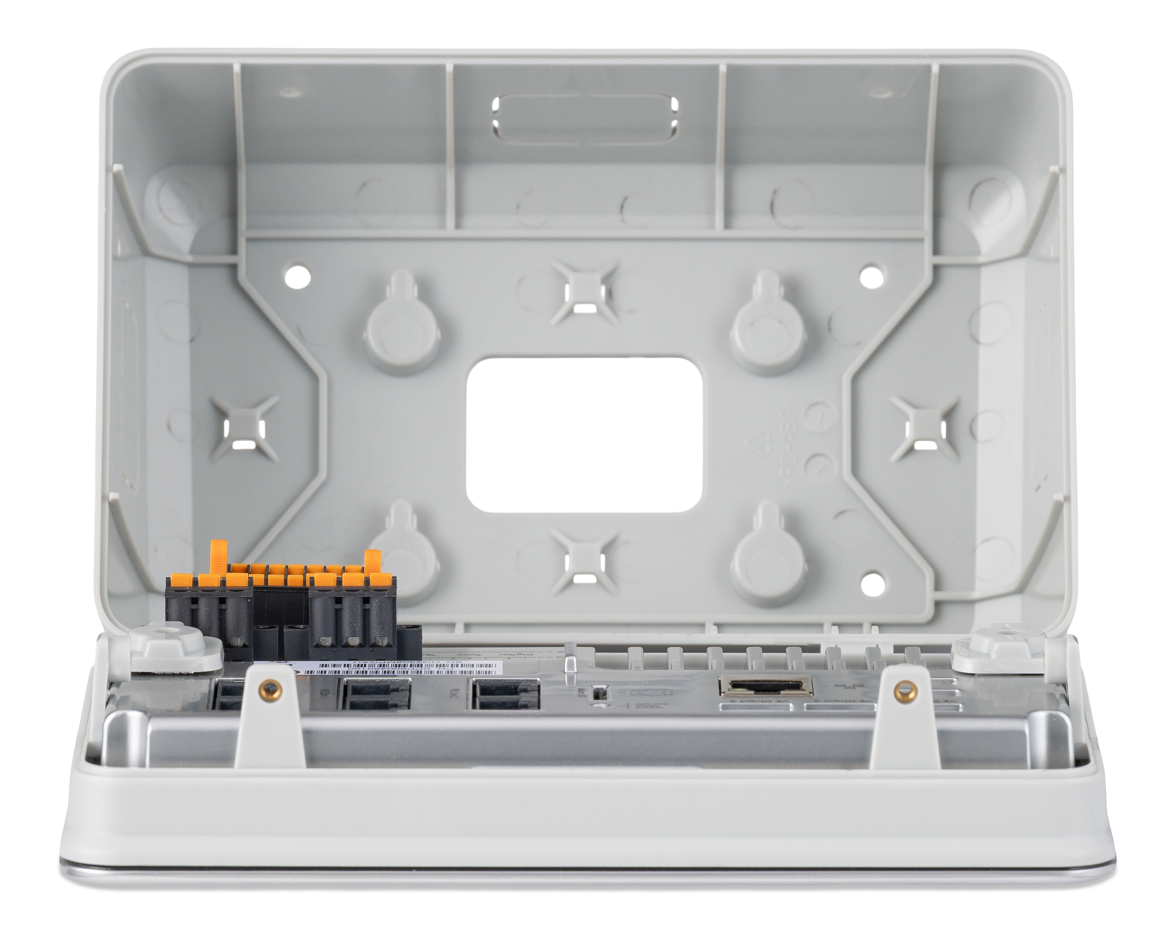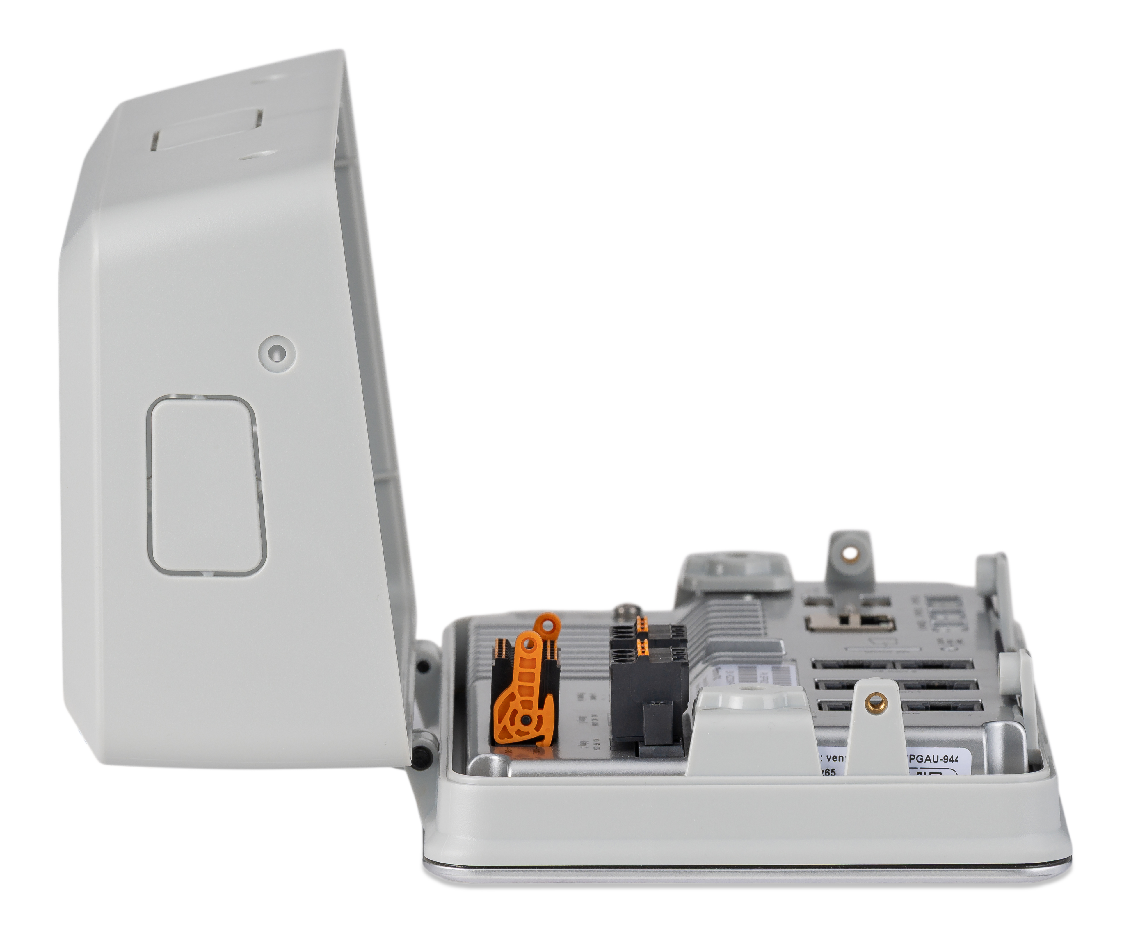 The enclosure is easily accessible: it opens from the top with two screws and folds forward without being removed from the wall, allowing straightforward connection of additional cables to the interfaces of the Ekrano GX from the sides, top, bottom, or back.